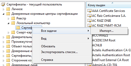 - Кликнуть правой кнопкой на сертификаты и поочередно выбрать «Все задачи» => «Импорт…».