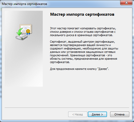 - В первом окне «Мастера импорта сертификатов» нажать «Далее».