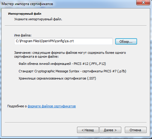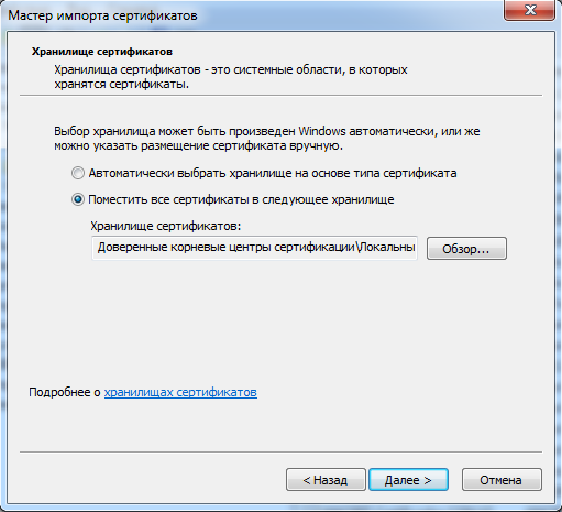 - Во втором окне нажать обзор и выбрать предоставленный сертификат и нажать «Далее».