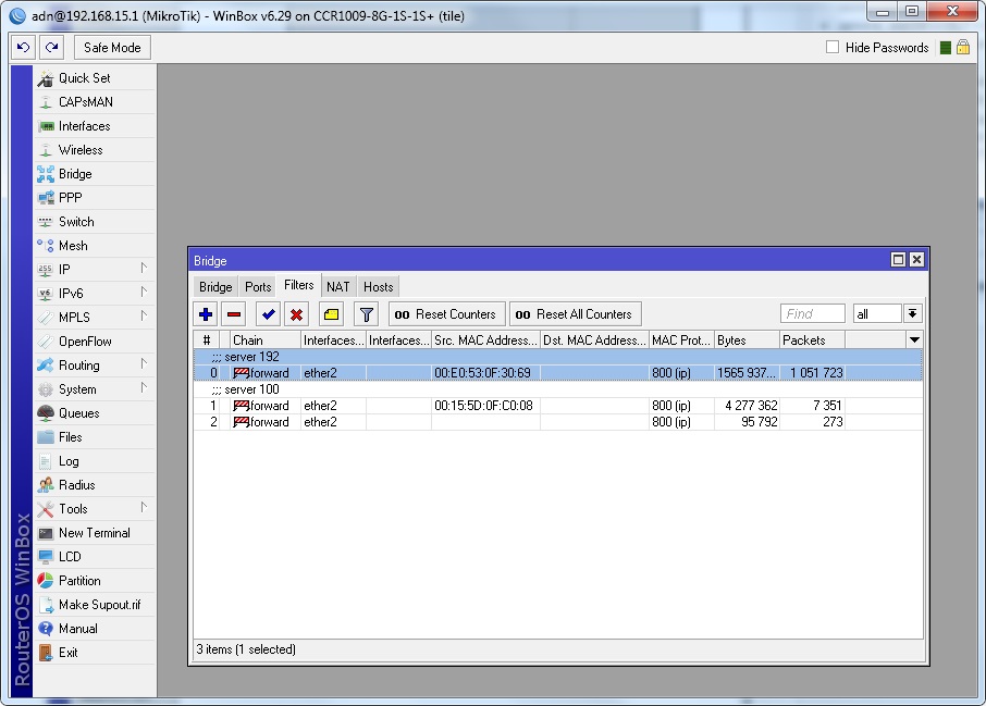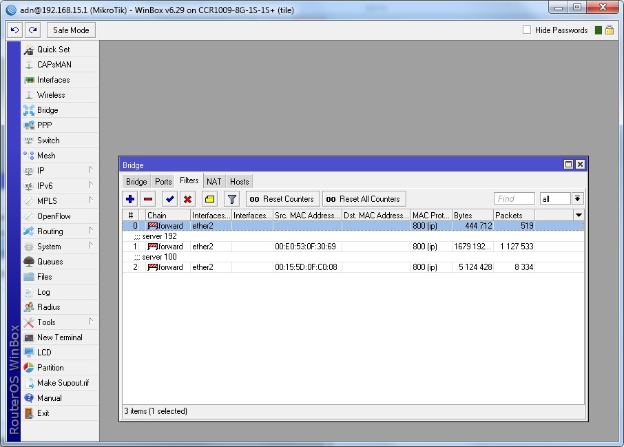 Теперь мы видим, что и через разрешающее правило проходит трафик только для того mac-адреса, который мы указали, и только для этого порта. Остальной трафик блокируется. Эти действия исключают возможность подмены mac-адресов пользователями.