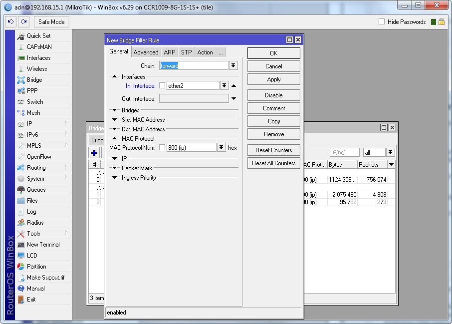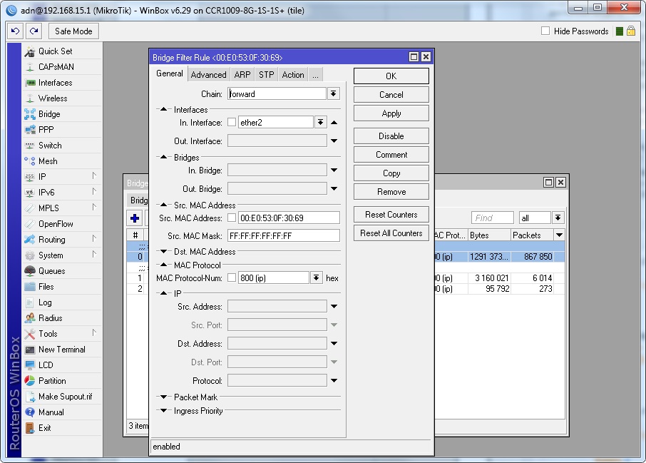Первым делом, запрещаем прохождение для всех mac-адресов через mikrotik routerboard. Как вы наверное знаете, за проходящий трафик через mikrotik routerboard отвечает цепочка forward. Поэтому, в новом правиле выбираемChain:forward. Далее указываем для какого интерфейса будет применяться данное правило. Выбираем In. Interface: то есть тот, к которому подключен компьютер пользователя. Также выбираем 800(IP) для MAC Protokol-Num.